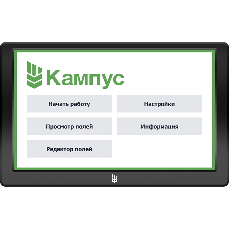 Агронавигатор «Кампус» создан на основе двухъядерного процессора (2100 МГц), оперативная память — DDR2, 512 Мб. Сенсорный дисплей 18*10 см, диагональ 8”. Предусмотрена поддержка SD/MK-карт, имеется внешняя патч (полосковая направленная) антенна, выполнение экспорта в формат KML.